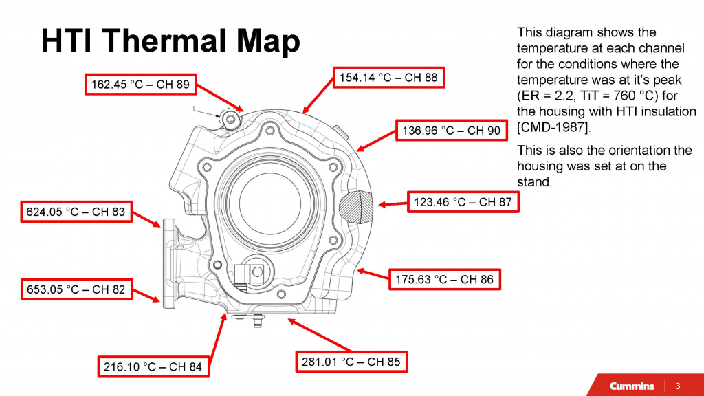 A turbine housing thermal survey documents a baseline condition (no cladding) and an HTI-insulated condition CMD1987. Both are shown at the peak condition (ER = 2.2, TiT = 760°C) with channel-based readings and orientation notes for traceability.
